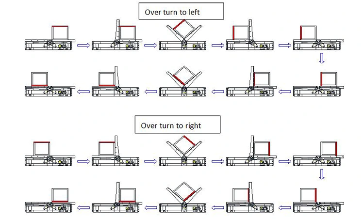 Udstyret består af en hovedmaskine, et hydraulisk system og et elektrisk kontrolsystem. En gruppe på to stråleflippere bruges til samtidig at vælte og bevæge sig. Flippeprocessen for de to stråleflippere styres af avancerede hydrauliske synkroniseringsventiler for at sikre synkron rotation af hver væltningsarm under vippeprocessen. Kontroller omsætningsprocessen for emnet for at opnå en 90 ° omsætning af emnet.