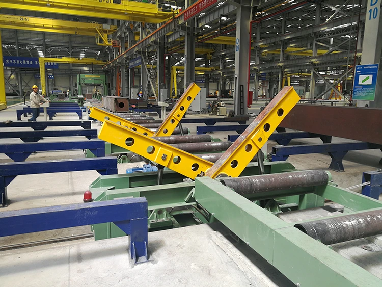 To pc'er med bevægelige 180 ° hydrauliske stråleflippere er tilvejebragt i hvert sæt, hovedsageligt brugt til at dreje arbejdsemner efter svejsning på den ene side. Når du arbejder, skal du løfte emnet væk fra rullebordet eller emnetsstativet, og reduktionen driver de to væltningsbeslag for at bevæge sig synkront for at flytte emnet til siden af rullebordet eller arbejdsemne. Derefter driver to hydrauliske cylindre de to L-formede arme til at rotere synkront. Efter at emnet er væltet, flyttes det til midten af rullebordet eller arbejdsemnetstativet, og derefter transporteres emnet til den næste proces eller svejses.